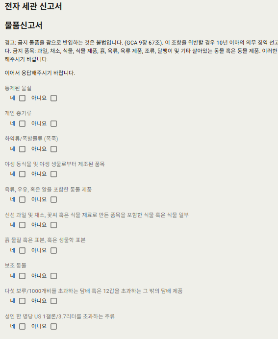 5. 정보입력이 끝나면 물품신고 항목이 나오는데 거의 해당이 없어서 □아니오 에 체크를 했어요